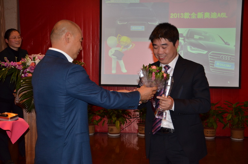 聚会盛大表扬了公司历史上首个年度董事长卓越孝顺奖和年度董事长优异孝顺奖,药品销售公司总司理王军民获得年度董事长卓越孝顺奖,上虞银娱geg优越会总司理朱志斌和总司理助理周林获得年度董事长优异孝顺奖,董事长吕钢亲自宣读颁奖词,并为他们揭晓奖品,年度董事长卓越孝顺奖奖品为2013款全新奥迪A6L,年度董事长优异孝顺奖奖品为欧米茄De ville 2013新款手表。